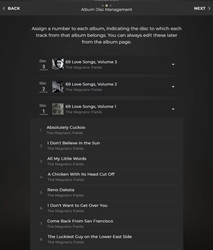 Consequently, it can be determined that this is a multi-disc set due a duplication of the track numbers, so we are now given the chance to correct the Disc numbers in a very quick process. In this case, it is easy to know what the correct Disc Number by the Album Title, and I can also tap on the drop-down to look at the tracks of that album to check this:
