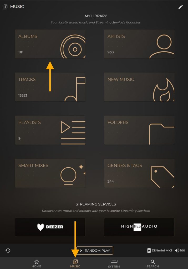 1. Navigate to the Albums section in Sense. You can do this by selecting the Music tab on the Sense dashboard, which you can access through my.innuos.com or through the Sense app.