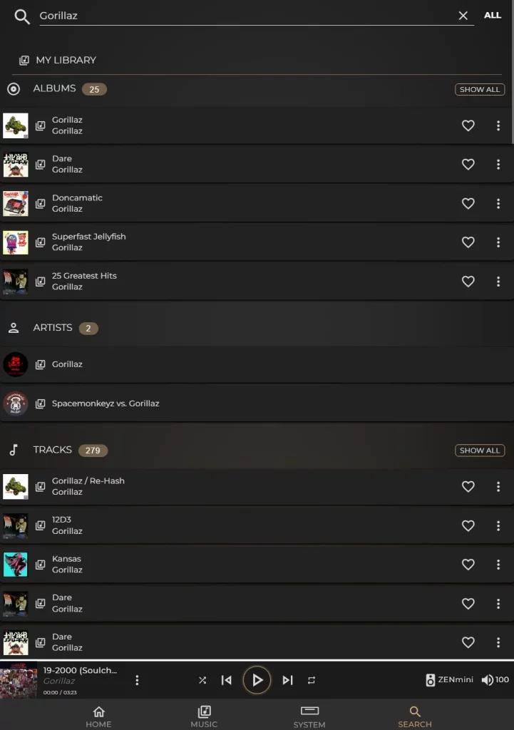 The Search tab allows you to quickly find any artist, album, playlist or track available by typing it into the search bar.