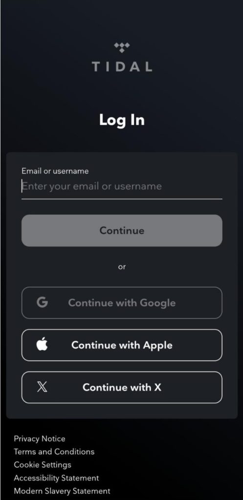 2. Here you can now login to TIDAL via multiple methods such as directly with your email/password or integration with Google, Apple or X (formerly Twitter).